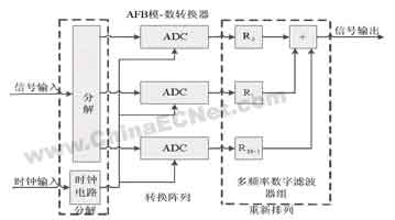 在FPGA内采用AFB法来处理接收到的数据,以达到所期望的信号输出。AFB ADC结构克服了时间交叉采样结构对转换器之间的失配极为敏感的缺点以及开关电容结构的速度和噪声方面的限制,同时减小了由增益和相位失配引起的误差。“Advanced Filter Bank”所指的滤波器组既包括数字滤波器,也包括模拟滤波器,不同于只包括数字滤波器的普通滤波器组。AFB ADC采用模拟分解滤波器,将输入分解成m通道的模拟输入信号,系统的理想采样率为每一个转换器通道的m倍,分辨率与每一个通道的分辨率相同。